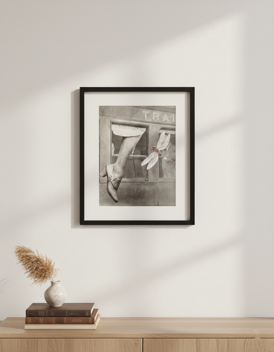 「Travelers(旅行者たち)」と題された本作は、ヴィンテージの紙片や図像を巧みに組み合わせ、どこかへ向かう人々や、過ぎ去っていく風景の記憶を閉じ込めたような一作。